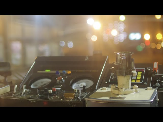 路面電車の駅から階段と電車が過ぎ去っていくショット